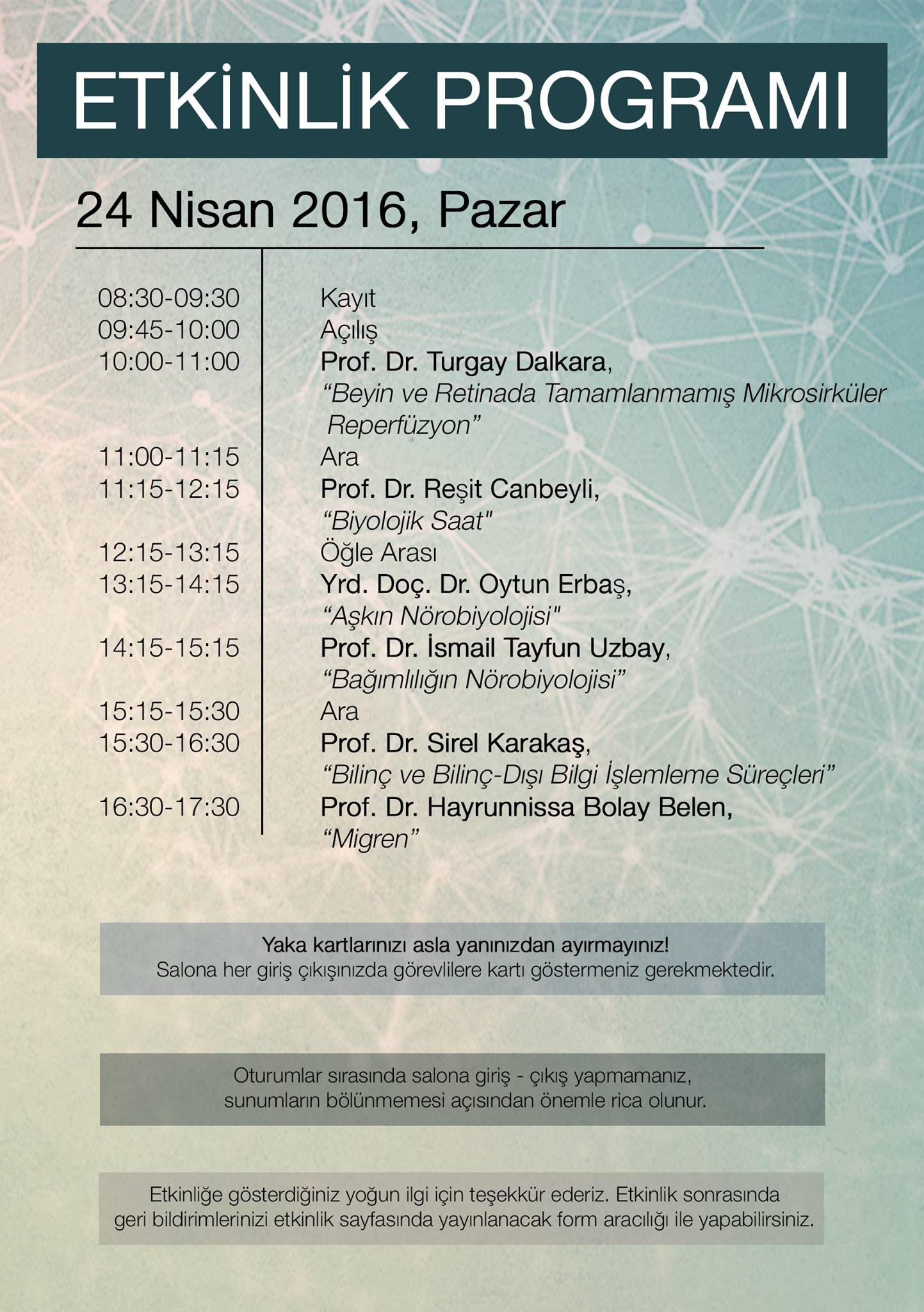 ODTÜ Biyoloji ve Genetik Topluluğu tarafından düzenlenen 2. ODTÜ Sinir Bilim Günü etkinliğinde, “Bilinç ve Bilinç-Dışı Bilgi İşlemleme Süreçleri” konusunda bir konferans vereceğim.
