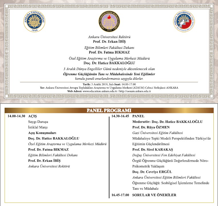 Dünya Engelliler Günü, 1992 yılından bu yana farkındalık yaratmak ve engellilerin sorunlarına dikkat çekmek için kutlanıyor. Ankara Üniversitesi Eğitim Fakültesi ve Özel Eğitim Araştırma ve Uygulama Merkezi'nin ortaklaşa düzenlediği panelde, Özgül Öğrenme Bozukluğu olan bireylerin sorunlarına dikkat çekiliyor, bozukluğun sağaltımında yeni yaklaşımlar açıklanıyor.