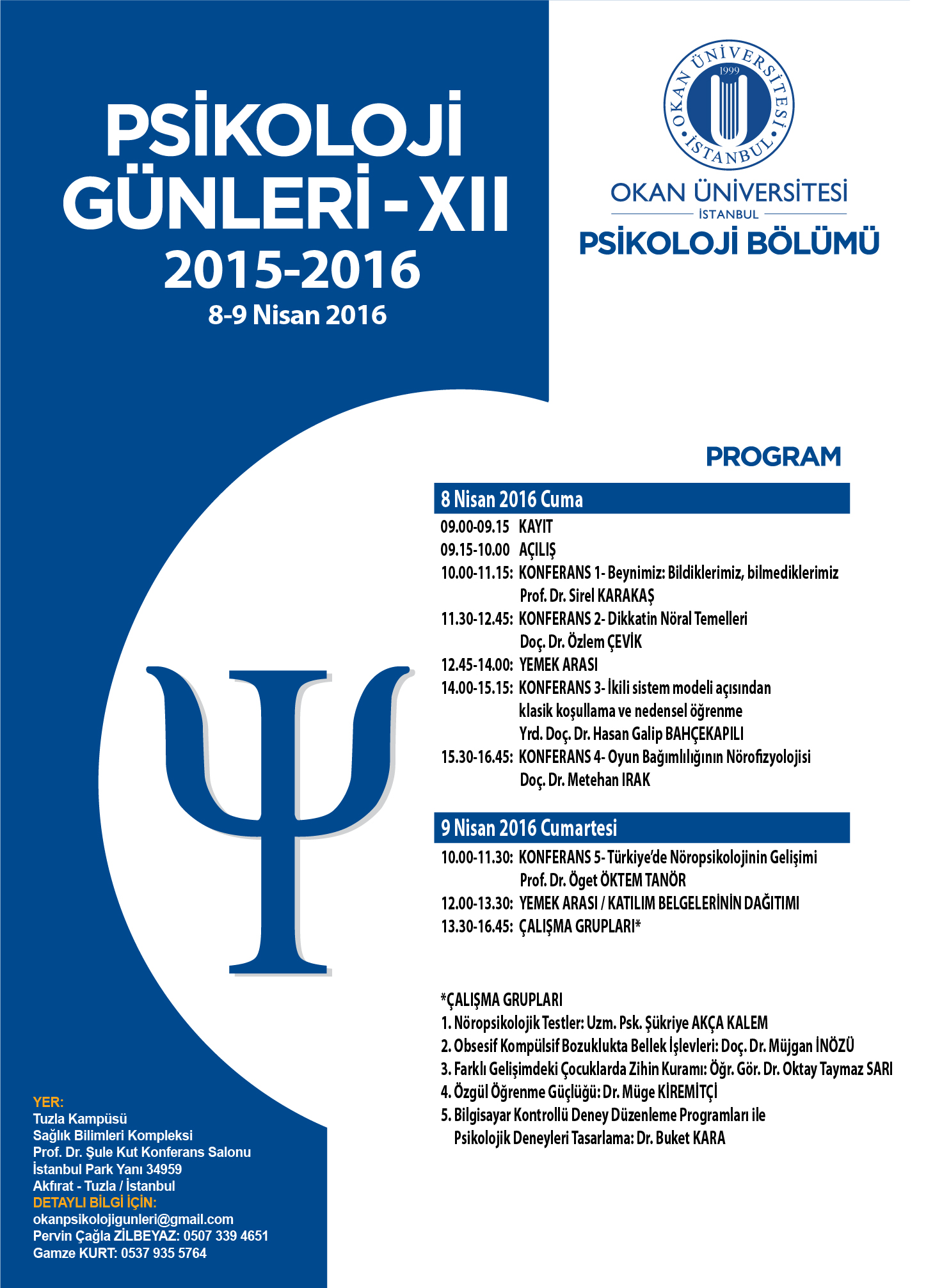 Okan Üniversitesince 8-9 Nisan 2016 tarihleri arasında düzenlenen “Psikoloji Günleri-XII”nin teması bilişsel nörobilimdir.